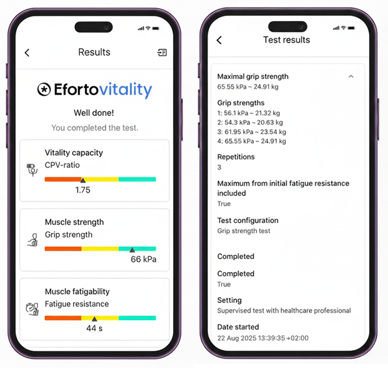 These reference data are driven from research conducted with academic partners and validated cohorts with adjusted thresholds for muscle strength, muscle fatigability, and capacity-to-perceived vitality ratio (CPV ratio).You can learn more about test interpretation and ways to improve grip performance here: